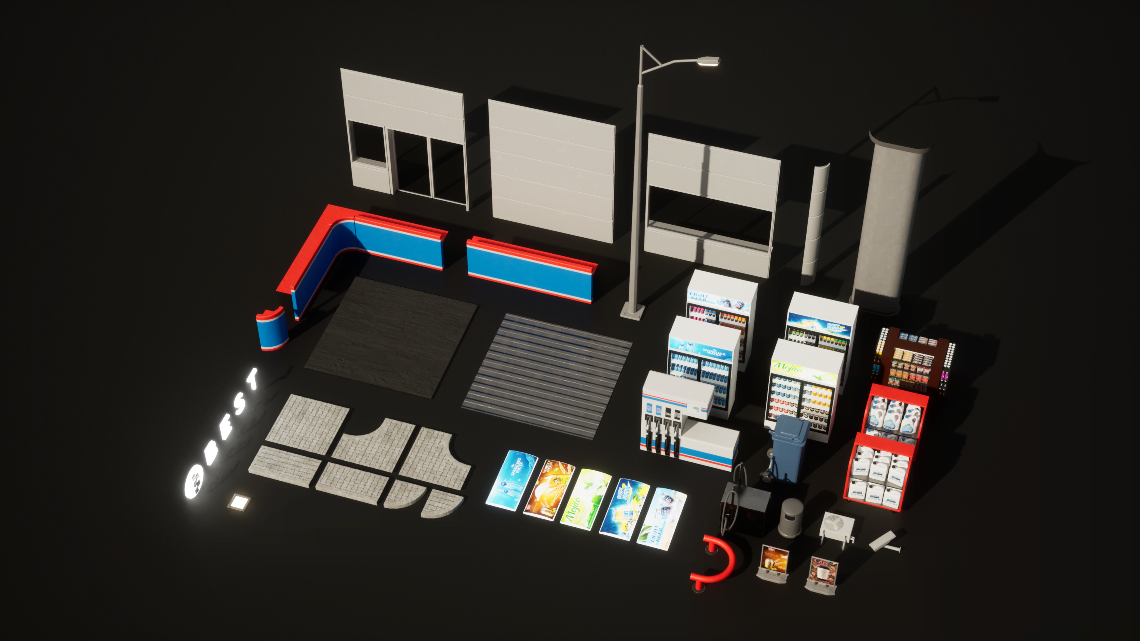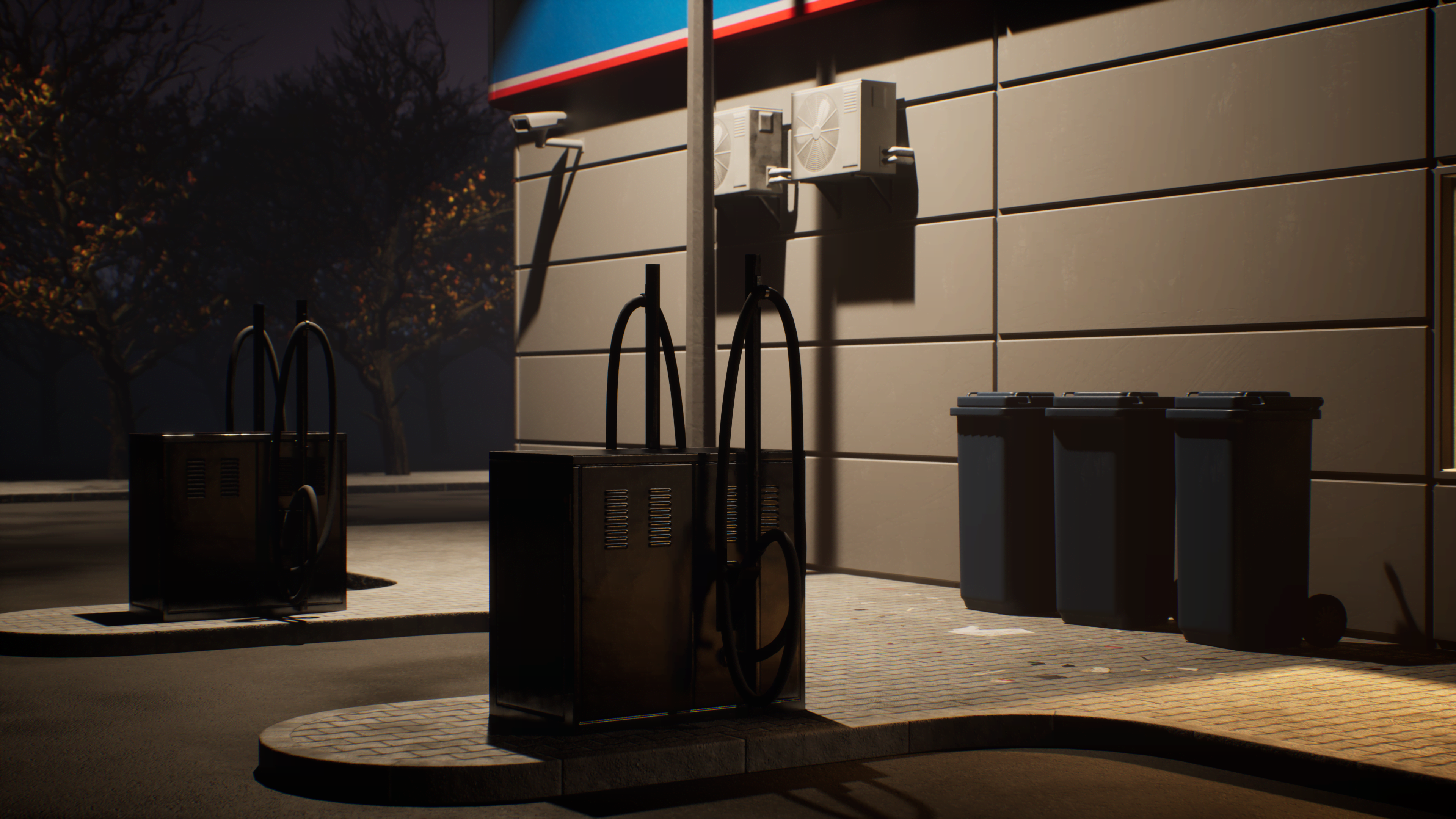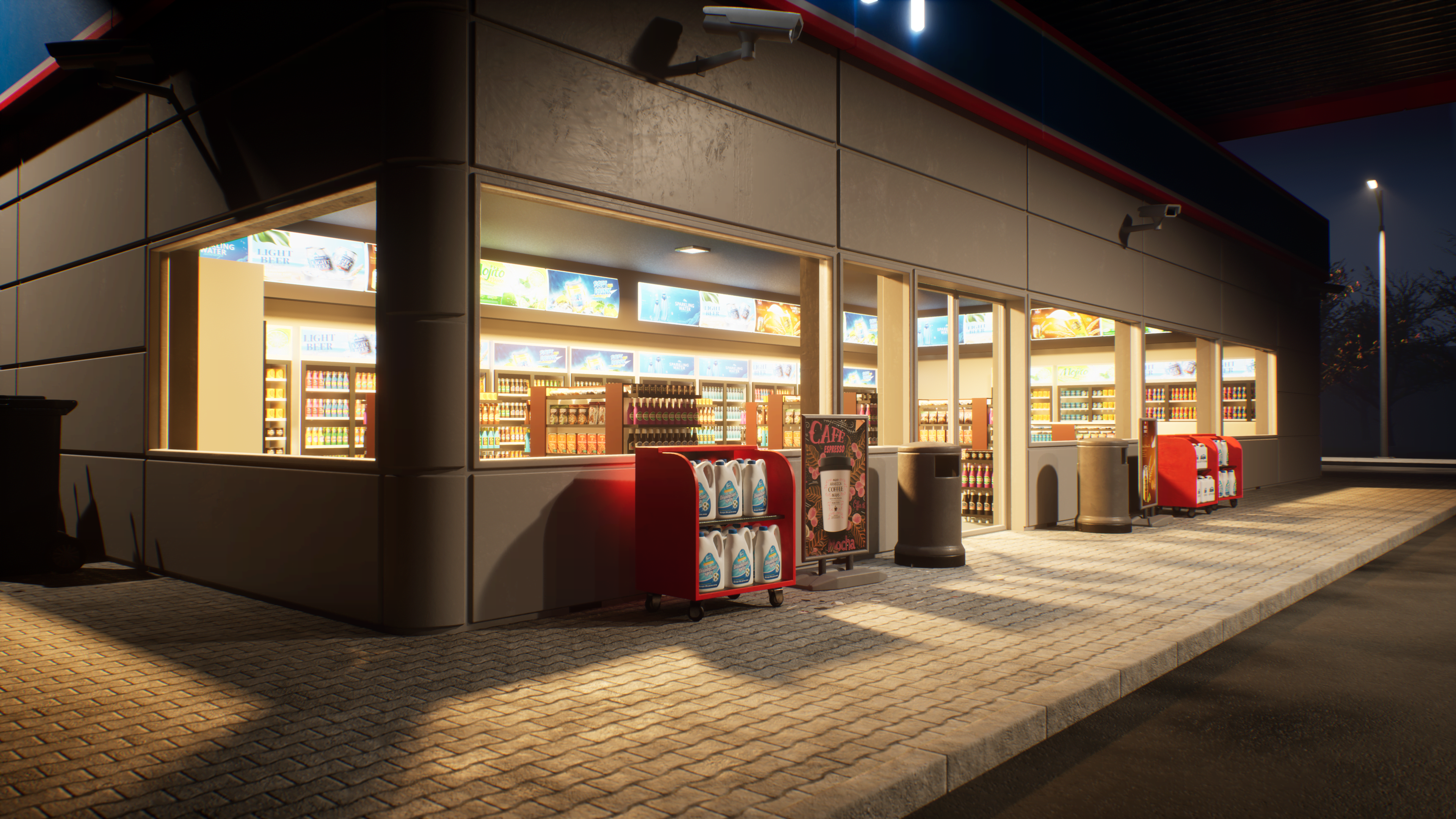 This modular building and props were formerly made for VR open world simulator in Unity. That forced me to keep everything in quite low details and polycount. I migrated the project to Unreal Engine 5 to give it new life with more interesting lighting and store interior (previously in Unity windows were all black with reflection probes for optimization) and some new props such as cameras.